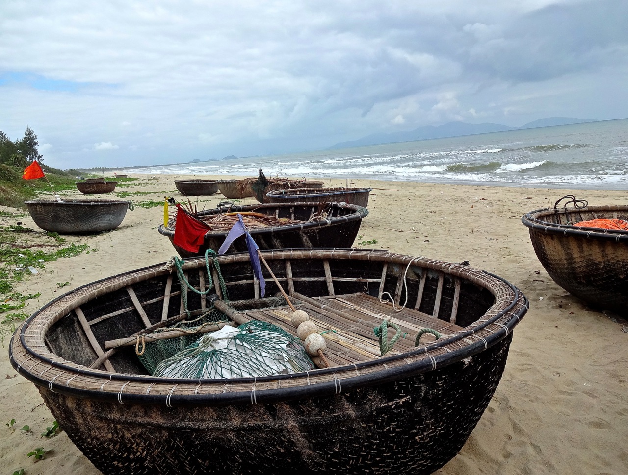 At the beach, we saw about two dozen giant straw baskets, obviously used as a type of fishing boat by the people nearby. The boats contained their home-made lures and tackle and showed signs of being used recently. We abandoned our bikes and played in the warm South China Sea, watched a light rain roll in from the ocean, long enough to only scare us and then started the long trek back to Hoi An and the noise and bustle of the city.