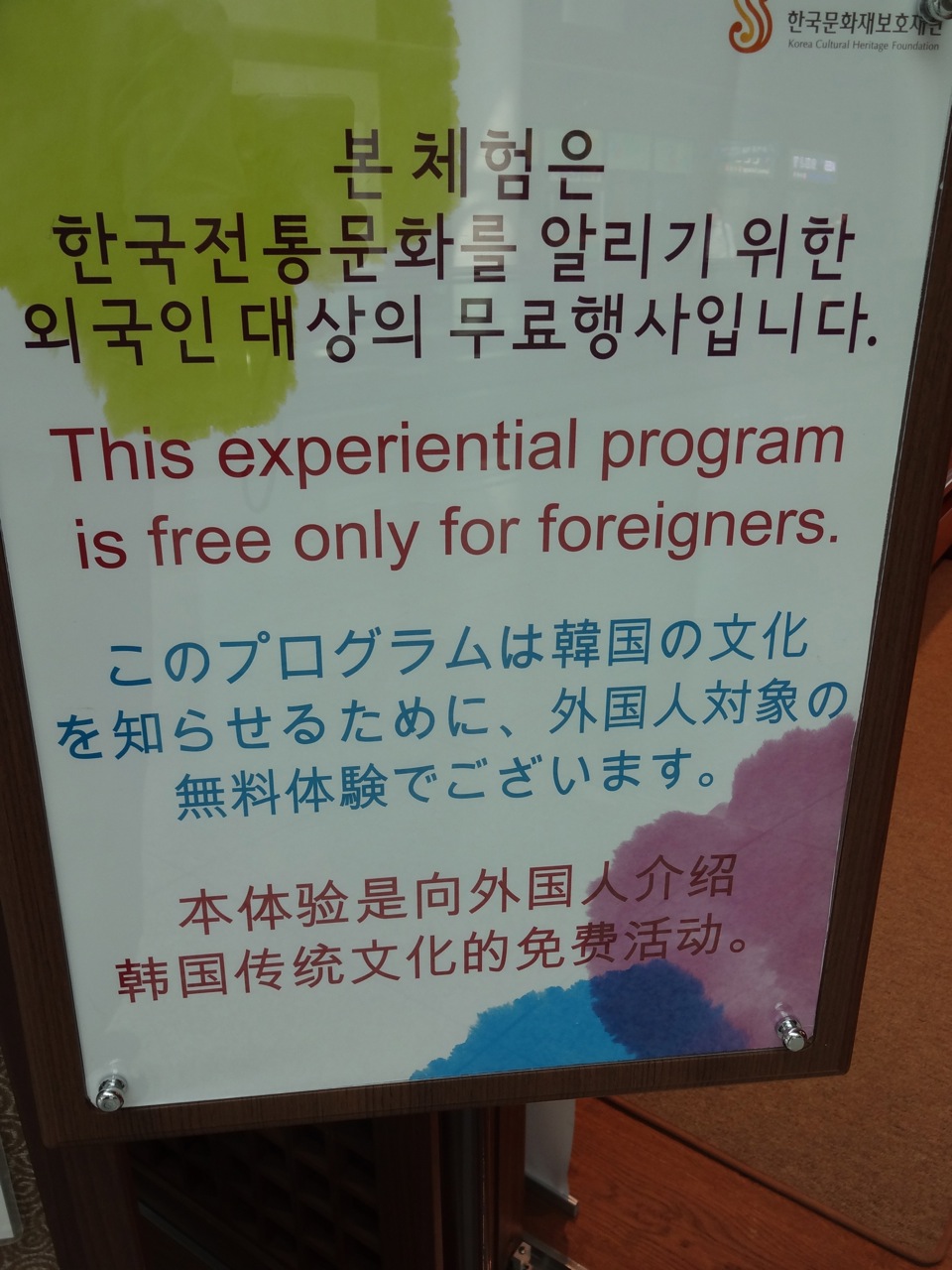 Despite the recent ranting and threats by North Korean lunatic, Kim Jong Un, Alex and I flew through Incheon Airport near Seoul twice recently on our trip to Japan. The airport in Seoul is one of the best in Asia and features not one but two Korean Traditional Cultural Experience Centers for visitors-at least visitors with foreign passports a sign informed us.