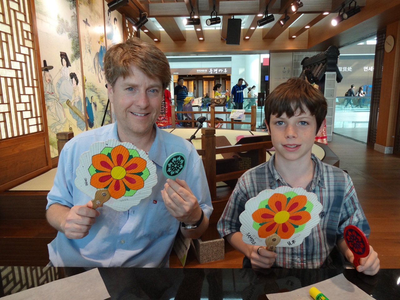 On the way back, Alex was disappointed that we had to change terminals and would end up far from the Korean Traditional Cultural Experience Center we enjoyed a week earlier. As we made our way to our plane back to China, we discovered yet another branch of the Korean Traditional Cultural Experience Center and one that featured new crafts to make and new musicians. This time we settled into making small hand mirrors with colorful designs. Like last time, we were wrapped up in less than a half hour and on way to the gate with more souvenirs.