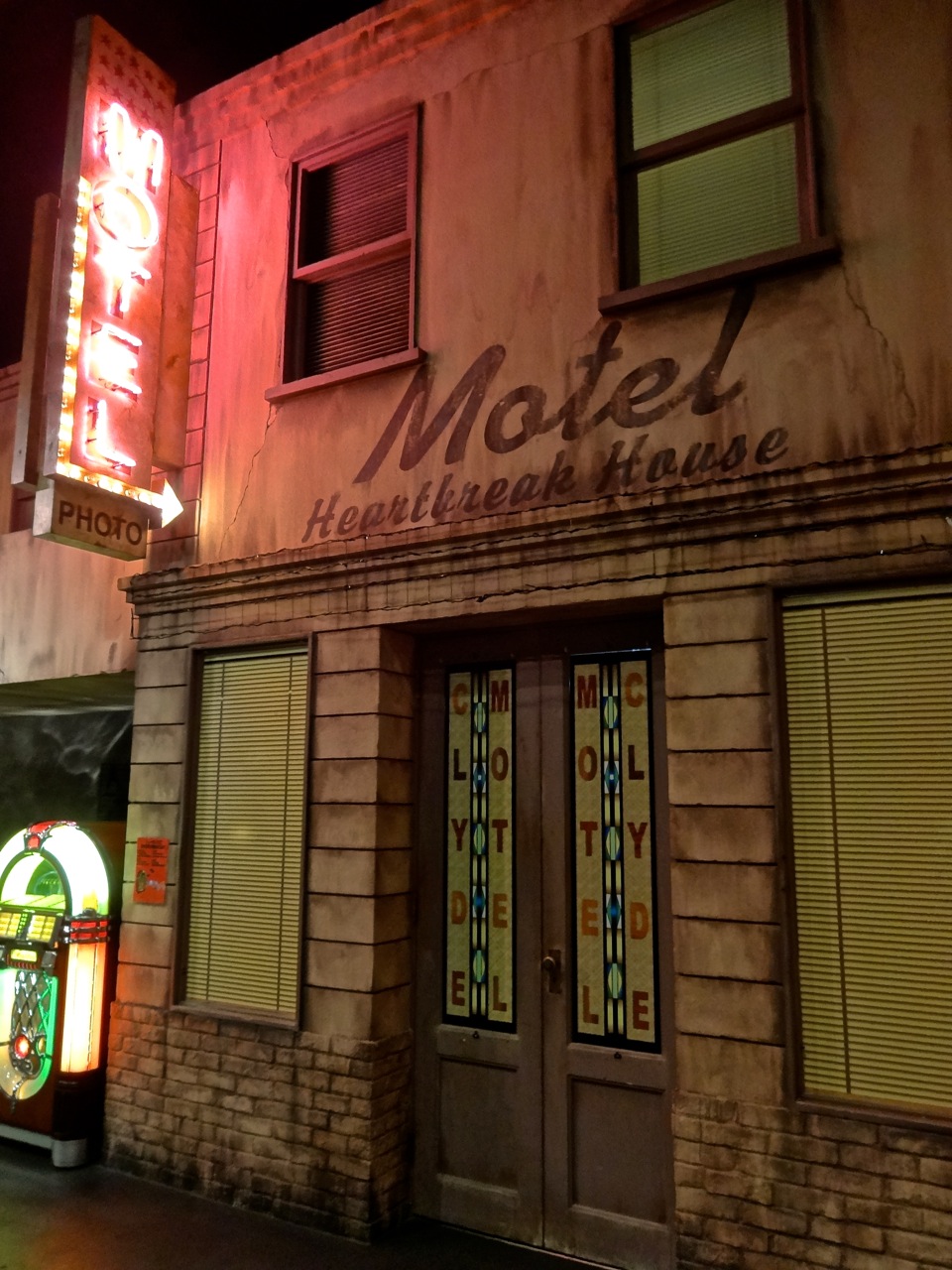 Pure Americana in a part of the Toyota historic car museum in Odaiba that features a 1964 and a half Ford Mustang and a 1966 Corvette Stingray next to a Wurlitzer "Bubbler" jukebox and Route 66 motel.