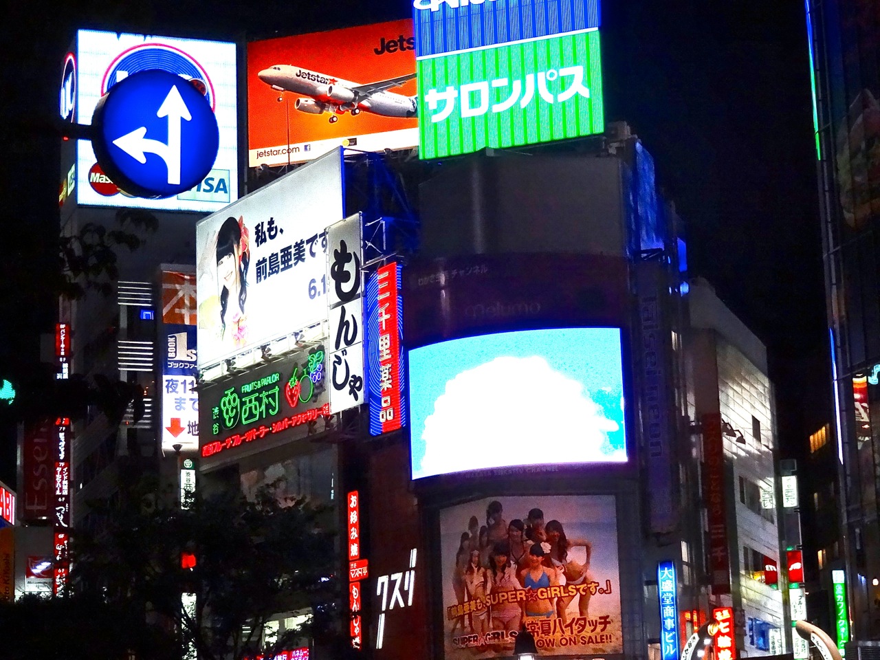 Giant moving screens of light create never-ending daylight in the Shibuya area of Tokyo.