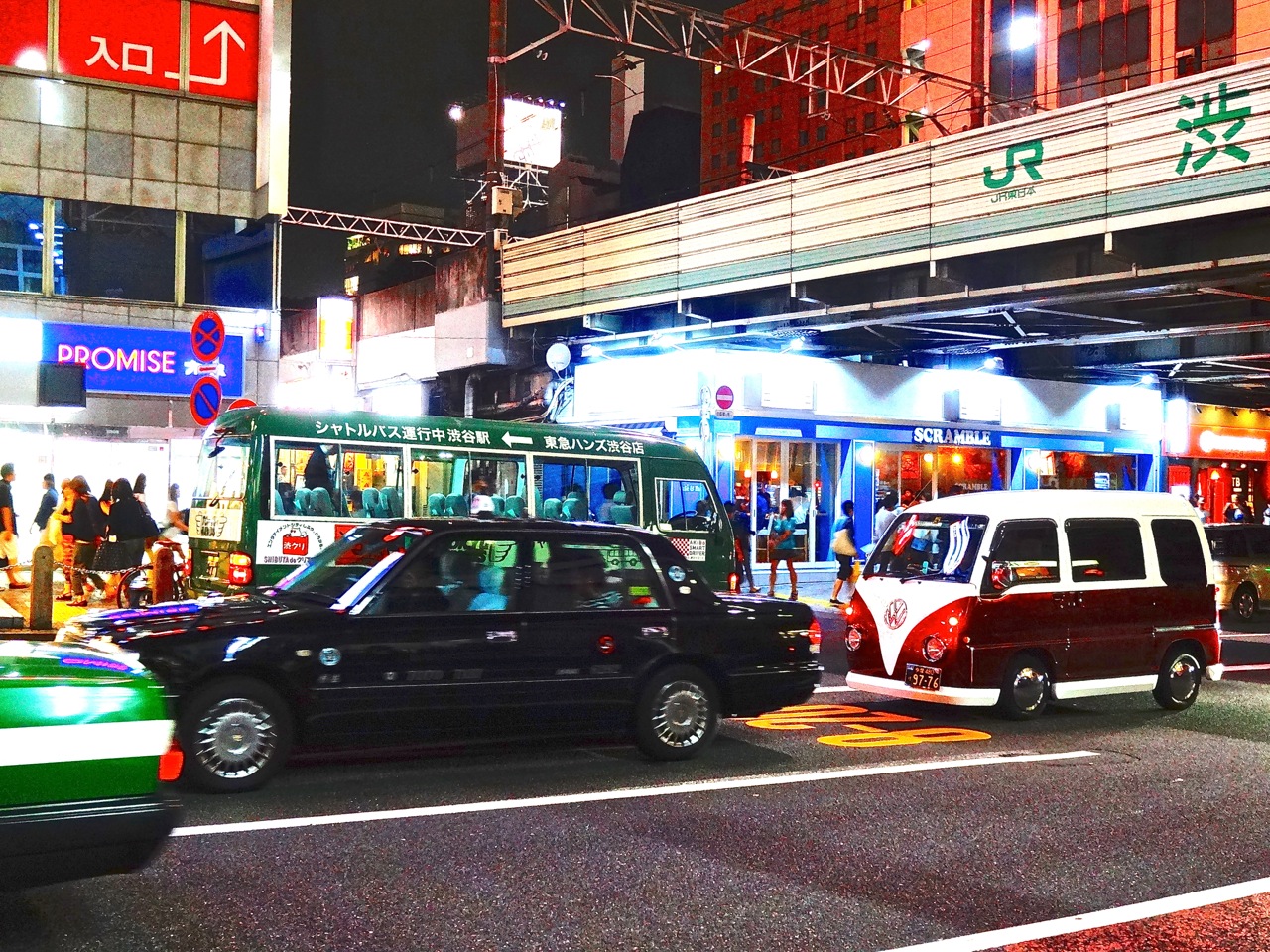 A VW microbus amid black cabs passes under a Japan Rail train bridge in Shibuya-Tokyo’s and the world’s busiest places.