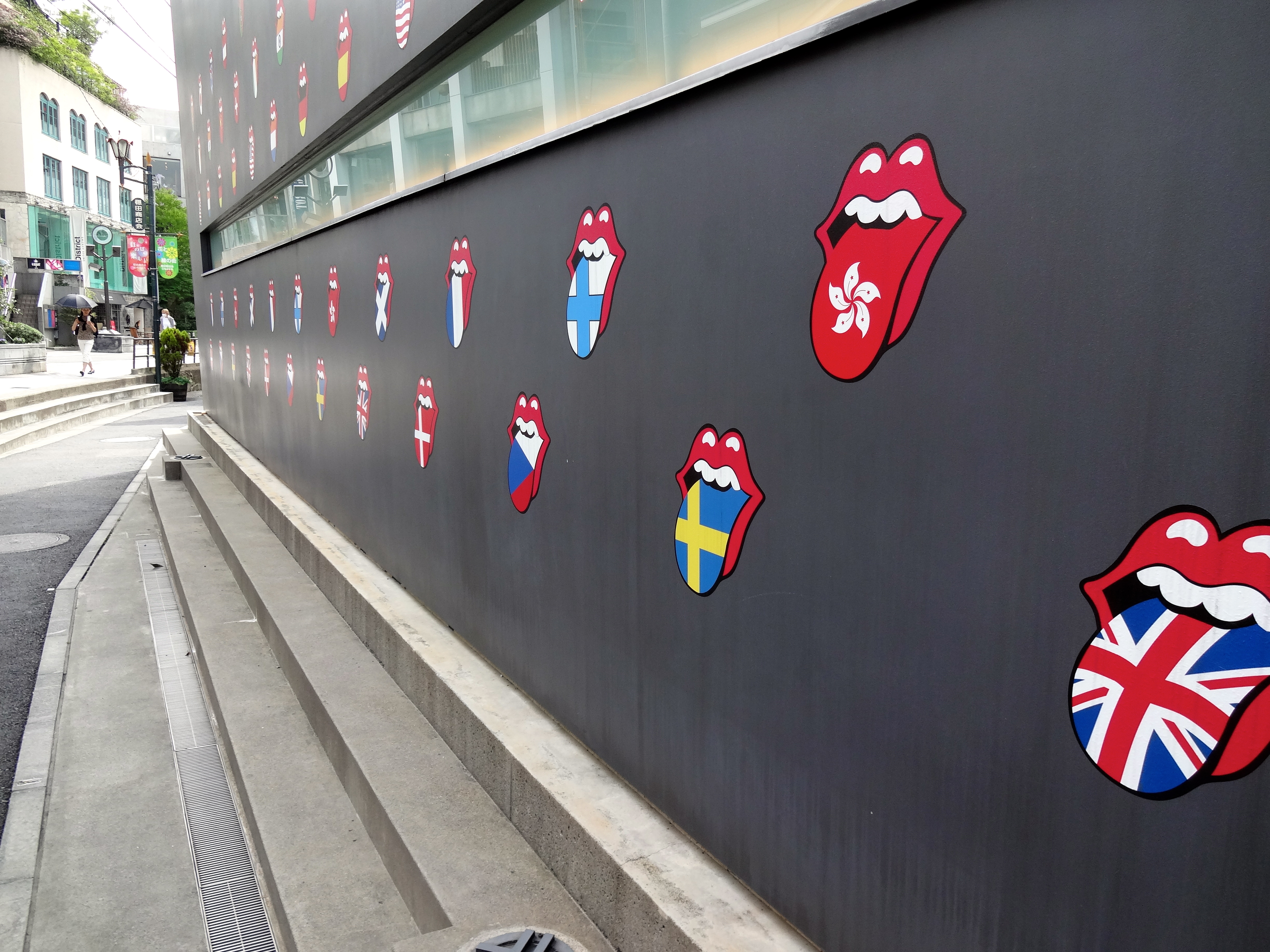 The Rolling Stones logos adorn a neighborhood wall. Alex poses under a sign along a side street in Tokyo.[/caption]
