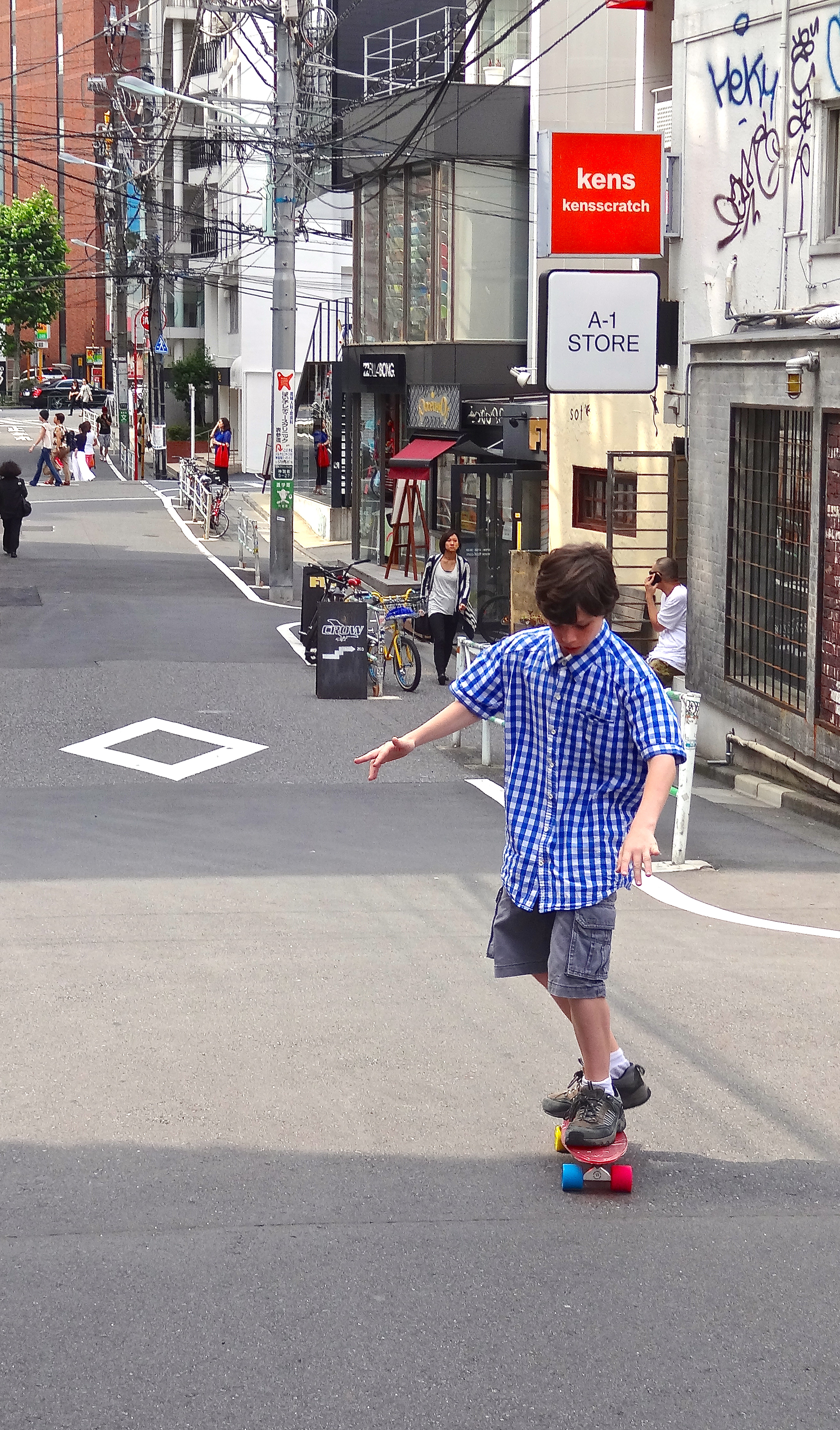 Alex take a long penny-board ride down the gentle hill and mostly pedestrian Cat Street near Shibuya. Alex asked for a skateboard even before we moved to China, but finally got his wish after a visit from a skateboard shop on Cat Street.Despite being one of the mostly densely-populated cities in the world, Tokyo feels safe for pedestrians and skateboarding teens alike.