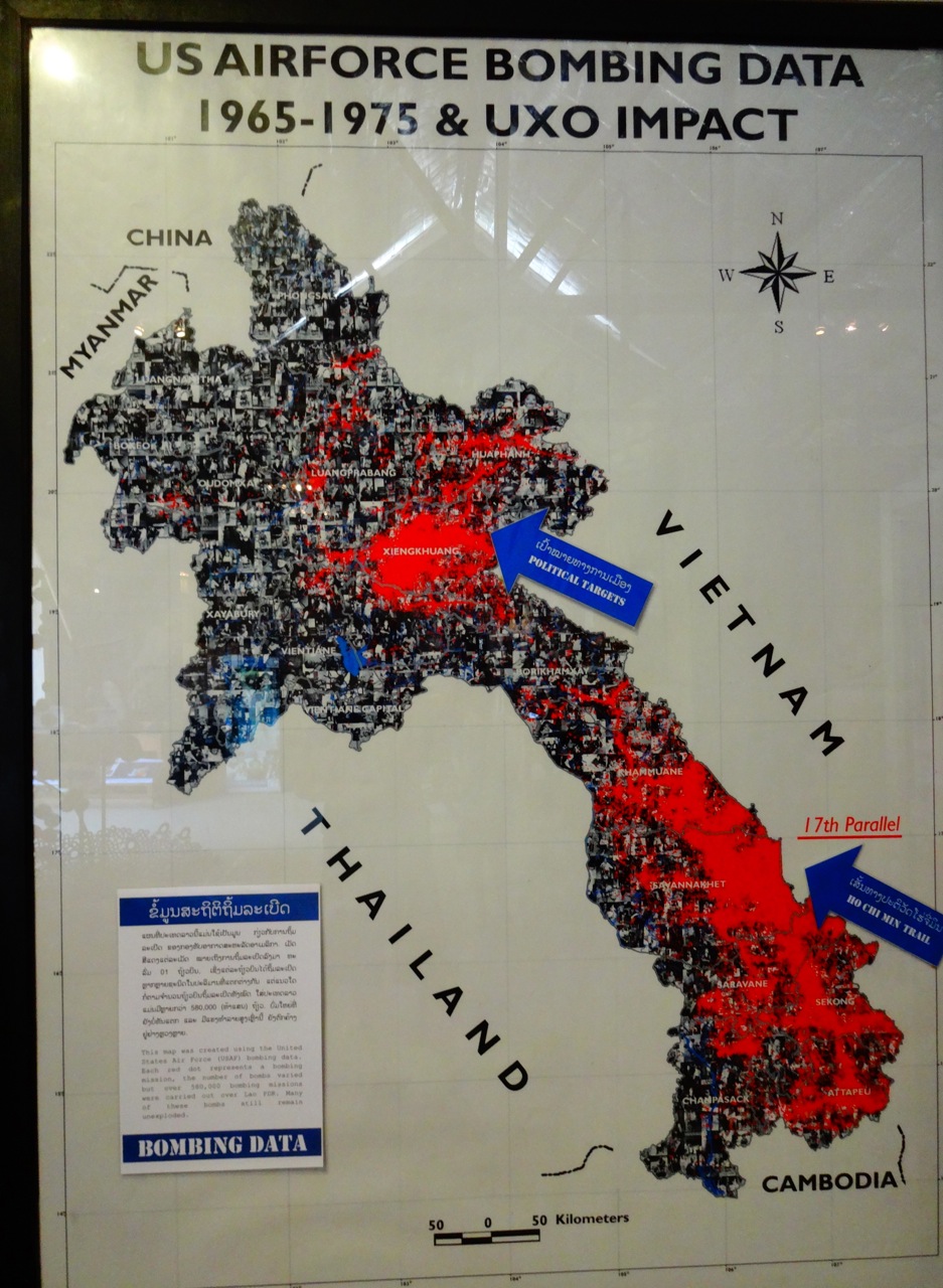 From our tour, and watching a short film on the subject, we learned that approximately 300 new casualties a year come from unexploded ordinance, namely cluster bombs-2 millions pounds worth the US dropped on Laos from 1964 to 1973. With a success rate of 70%, the number of failed submunitions (cluster bombs) hiding in rivers, under a few inches of soil or laying at the edge of a farmer’s field in Laos is potentially and roughly tens of millions, each capable of death, dismemberment and blindness.